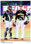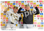 2019年4月14日 中日戦 お立ち台でポーズを決める梅野(左)と西 |