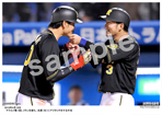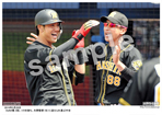 2019年4月18日 ヤクルト戦 4回、2ランを放ち、糸原(右)にアゴタッチをする中谷 |