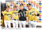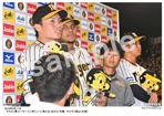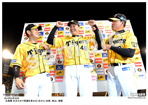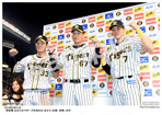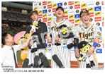2019年9月18日 ヤクルト戦 お立ち台で笑顔を見せる(右から)大山、近本、島本 |