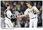 2019年4月18日 ヤクルト戦 完投勝利を挙げ、矢野監督(左)とガッチリ手を握り合う岩田 |