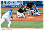 2019年8月8日 ヤクルト戦 6回、北條の適時二塁打で、激走し本塁へ滑り込む一走・原口 |