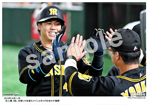 2019年5月21日 ヤクルト戦 4回、木浪の適時打で生還し、ナインとタッチを交わす梅野 |